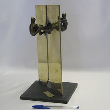 ESCULTURA FORMADA POR PLACA EM BRONZE (30,5X17 CM), RECORTADA, AO CENTRO, NO FORMATO DA LOGOMARCA DA EMPRESA CRISTÁLIA. PRÓXIMO AO TOPO, DE CADA LADO DA PEÇA, FIGURA HUMANA SUSTENTANDA PELO CONTRAPESO DA OUTRA FIGURA HUMANA. AMBAS SEGURAM MESMA CORDA NAS MÃOS. FIXADA EM BASE DE GRANITO RÚSTICO (1X17X17 CM), ONDE HÁ PLACA METÁLICA COM A GRAVAÇÃO ''PARCERIAS' / CRISTÁLIA PRODUTOS QUÍMICOS FARMACÊUTICOS LTDA / 22 DE SETEMBRO DE 2009'.