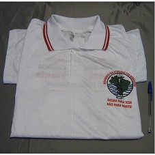 CAMISA PÓLO (TAM GG) EM MALHA BRANCA, DE MANGA CURTA. NA FRENTE, LOGOMARCA DO 'MOVIMENTO DOS ATINGIDOS POR BARRAGENS' E A INSCRIÇÃO 'BRASIL / ÁGUAS PARA VIDA NÃO PARA MORTE'. ATRÁS, 'ÁGUA E ENERGIA, NÃO SÃO MERCADORIA / É PARA SOBERANIA DO POVO BRASILEIRO / MOVIMENTO DOS ATINGIDOS POR BARRAGENS'.