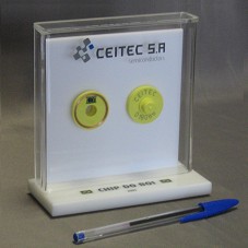 AMOSTRA DO 'CHIP DO BOI', DA EMPRESA 'CEITEC S.A SEMICONDUCTORS'. FIXADO EM BASE CIRCULAR (30 MM) NA COR AMARELA, ACOMPANHANDO OUTRA QUE FECHA O CIRCUITO, ONDE HÁ A INSCRIÇÃO 'CEITEC 018086'. ESTAS, EM PLACA DE ACRÍLICO BRANCO (12X12 CM). POSSSUI REDOMA DE ACRÍLICO, ONDE HÁ O NOME DA EMPRESA GRAVADO. NA BASE, 'CHIP DO BOI / 2009'.