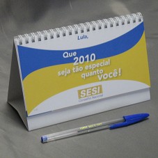 CALENDÁRIO DE MESA, DO ANO DE 2010. NA PRIMEIRA FOLHA, CAPA, A INSCRIÇÃO 'LULA, QUE 2010 SEJA TÃO ESPECIAL QUANTO VOCÊ'. NA FOLHA DE CADA MÊS HÁ UMA FOTOGRAFIA COM O NOME DO PRESIDENTE LULA ESCRITO DE MANEIRAS DIFERENTES. ACONDICIONADO EM CAIXA DE PAPELÃO, QUE POSSUI A MESMA INSCRIÇÃO DA CAPA.