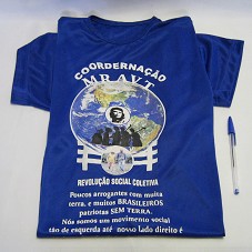 CAMISETA EM MALHA AZUL, DE MANGA CURTA. NA FRENTE, ESTAMPA COM DESENHO DO PLANETA TERRA, TENDO AO CENTRO IMAGEM DE 'CHE GUEVARA' E, ABAIXO, FOTOGRAFIA DE UM CASAL DE AGRICULTORES. POSSUI A INSCRIÇÃO 'COORDENAÇÃO MRAVT / REVOLUÇÃO SOCIAL COLETIVA / POUCOS ARROGANTES COM MUITA TERRA, E MUITOS BRASILEIROS PATRIOTAS SEM TERRA. NÓS SOMOS UM MOVIMENTO SOCIAL TÃO DE ESQUERDA ATÉ NOSSO LADO DIREITO É CANHOTO DAQUI ATÉ NO CÉU TUDO É NOSSO'. ATRÁS, 'MOVIMENTO REVOLUCIONÁRIO AGRÁRIO VITÓRIA NA TERRA / NÃO QUEREMOS SER COBAIAS DE EXPERIÊNCIAS AGRÍCOLAS'. CAMISA ESTÁ COM ALGUMAS MANCHAS DE SUJEIRA, COM PARTE DA GOLA DESCOSTURADA E APRESENTA ALGUNS FIOS PUXADOS.