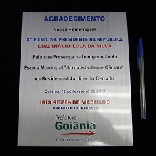 PLACA (25X20 CM) EM METAL PRATEADO, CONTENDO A INSCRIÇÃO 'AGRADECIMENTO / NOSSA HOMENAGEM AO EXMO. SR. PRESIDENTE DA REPÚBLICA LUIZ INÁCIO LULA DA SILVA / PELA SUA PRESENÇA NA INAUGURAÇÃO DA ESCOLA MUNICIPAL 'JORNALISTA JAIME CÂMARA', NO RESIDENCIAL JARDINS DO CERRADO. GOIÂNIA, 12 DE FEVEREIRO DE 2010 / ÍRIS REZENDE MACHADO / PREFEITO DE GOIÂNIA / PREFEITURA DE GOIÂNIA / O TRABALHO QUE VOCÊ VÊ'. ACONDICIONADA EM ESTOJO FORRADO DE VELUDO PRETO (4X32X43,5X CM).