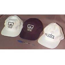TRÊS BONÉS. UM NA COR BRANCA, EM BRIM, TENDO BORDADO NA FRENTE, EM AZUL, 'INAMA' E RESPECTIVO SÍMBOLO; E, ATRÁS, 'WWW.INAMA.ORG.BR'. OS OUTROS DOIS, UM PRETO E OUTRO BRANCO, EM TACTEL, TENDO BORDADO NA FRENTE, 'GARCEZ RECURSOS HUMANOS', COM O RESPECTIVO SÍMBOLO; E, ATRÁS, 'WWW.GARCEZ.COM.BR'. ACONDICIONADOS EM CAIXA CIRCULAR (25X8 CM), COM MOTIVO XADREZ (CREME, VINHO, CINZA, MARROM) NA PARTE EXTERNA. TEM NA PARTE INTERNA DA TAMPA, UM ADESIVO COM A INSCRIÇÃO 'INAMA'.