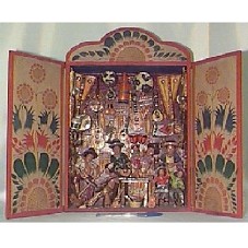 GRUPO DE MÚSICOS (ADULTOS E CRIANÇAS) AO REDOR DE UMA MESA DE MADEIRA, ALGUNS TOCANDO E OUTROS CONFECCIONANDO INSTRUMENTOS MUSICAIS. AO FUNDO, VÁRIOS TIPOS DE INSTRUMENTOS COMO VIOLÃO, VIOLINO, HARPA, SAXOFONE, FLAUTA, SANFONA, TAMBOR, PRATO, ETC. ACONDICIONADOS EM CAIXA DE MADEIRA, COM O FORMATO DE UM ORATÓRIO, COM PINTURA DE FLORES EM TONS DE VERDE, AZUL, VERMELHO E ALARANJADO.