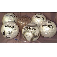 SEIS BOLAS DE FUTEBOL. TRÊS DE FUTEBOL DE CAMPO, MODELOS: 'PRECISION MP' (BRANCO METÁLICO/PRETO), 'WORLD PLATINUM MP' (BRANCO/PRETO/DOURADO) E 'STAR PLATINUM MP' (BRANCO/PRETO/LARANJA). DUAS DE FUTEBOL SOCIETY, MODELOS: 'SOCIETY LOW IMPACT' (BRANCO/PRETO/DOURADO) E 'SOCIETY PMEPU' (BRANCO/AZUL/DOURADO). E UMA DE FUTEBOL, DA SÉRIE ANOS DOURADOS, EM COMEMORAÇÃO AO INÍCIO DO ESPORTE; MODELO 'PENALTY RETRÔ ANOS 30' (MARROM). TODAS COSTURADAS, EM MICROFIBRA.