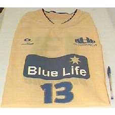 CAMISA REGATA (TAM G), MODELO DE BASQUETE, EM POLIÉSTER, NA COR AMARELA, COM DETALHES AZUIS NAS LATERAIS, GOLA E MANGAS. NA FRENTE, POSSUI A INSCRIÇÃO 'OVERTIME / A HEBRAICA / BLUE LIFE / 13', SENDO CADA MARCA ACOMPANHADA PELO RESPECTIVO SÍMBOLO. ATRÁS, '13 / OVERTIME', TAMBÉM EM AZUL.