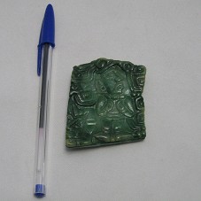 PLACA DE JADE (6,9X5,5 CM), COM CENA ESCULPIDA MOSTRANDO UM PERSONAGEM DE CORPO INTEIRO, DE ROSTO EM PERFIL E MÃOS SOBRE O PEITO. POSSUI FIGURAS SIMBÓLICAS AO REDOR. POSSUI UM FURO QUE ATRAVESSA A PLACA, NA PARTE SUPERIOR, POSSIBILITANDO A PASSAGEM DE UM CORDÃO. PLACA É UMA RÉPLICA DO PERÍODO CLÁSSICO, DE TAZUMAL, CHALCHUAPA. ACONDICIONADA EM CAIXA FORRADA DE PAPEL PRETO.