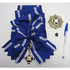 ORDEM NACIONAL JOSE MATIAS DELGADO, NO GRAU DE GRAN CRUZ PLACA DE OURO. CONDECORAÇÃO COMPOSTA POR: FAIXA NA COR AZUL, COM LISTRAS EM AZUL CLARO NAS LATERAIS, CONTENDO INSÍGNIA, EM METAL DOURADO, NO FORMATO DE UMA CRUZ, DE COR AZUL, COM MEDALHA AO CENTRO CONTENDO A EFÍGIE DE JOSE MATIAS DELGADO, NO REVERSO, A INSCRIÇÃO 'HONOR A LOS PROCERES DE LA INDEPENDENCIA SALVADOREÑA'; UMA PLACA EM METAL DOURADO, CONTENDO A MESMA INSÍGNIA; E UM BÓTON EM TECIDO AZUL, COM AZUL CLARO, COM BASE EM METAL DOURADO. ACONDICIONADO EM ESTOJO FORRADO DE VELUDO AZUL, TENDO NA TAMPA PLACA COM NOME DA CONDECORAÇÃO.