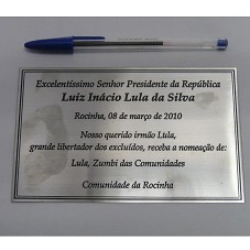 PLACA (10X15,5 CM) EM METAL PRATEADO. POSSUI A INSCRIÇÃO 'EXCELENTÍSSIMO SENHOR PRESIDENTE DA REPÚBLICA LUIZ INÁCIO LULA DA SILVA / ROCINHA, 08 DE MARÇO DE 23010 / NOSSO QUERIDO IRMÃO LULA, GRANDE LIBERTADOR DOS EXCLUÍDOS, RECEBA A NOMEAÇÃO DE: LULA, ZUMBI DAS COMUNIDADES / COMUNIDADE DA ROCINHA'. ACONDICIONADA EM ESTOJO FORRADO DE LYCRA AZUL CLARA.