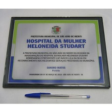 PLACA (20X25 CM) EM VIDRO FUMÊ, TENDO, NO ANVERSO, SOBRE FUNDO BRANCO COM BORDAS EM AZUL E VERDE, A INSCRIÇÃO 'PREFEITURA MUNICIPAL DE SÃO JOÃO DE MERITI / HOSPITAL DA MULHER HELONEIDA STUDARDT / A PREFEITURA MUNICIPAL DE SÃO JOÃO DE MERITI NA OCASIÃO DA INAUGURAÇÃO DO HOSPITAL DA MULHER... HOMENAGEIA O PRESIDENTE LUIZ INÁCIO LULA DA SILVA EM RECONHECIMENTO AOS RELEVANTES SERVIÇOS PRESTADOS AO MUNICÍPIO. SANDRO MATOS / PREFEITO / INAUGURADO EM 07 DE MARÇO DE 2010 - SÃO JOÃO DE MERITI -RJ'. ACONDICIONADA EM ESTOJO FORRADO DE TECIDO PRETO.