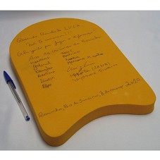 PRANCHA DE NATAÇÃO (34X23 CM) EM EVA LARANJA. NA FRENTE, LOGOMARCA DA PRANCHA 'ZOGGS'. ATRÁS, DEDICATÓRIA ASSINADA POR TREZE CRIANÇAS, 'QUERIDO PRESIDENTE LULA, NÓS TE AMAMOS / OBRIGADO POR FAZER A DIFERENÇA / ASS. AS CRIANÇAS DA ROCINHA / (ASSINATURAS) / ROCINHA, RIO DE JANEIRO, 8 DE MARÇO DE 2010'.