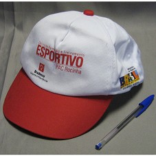 DOIS BONÉS IGUAIS, EM TECIDO BRANCO, COM ABA VERMELHA. NA FRENTE, A INSCRIÇÃO 'CENTRO DE FORMAÇÃO E TREINAMENTO ESPORTIVO / PAC ROCINHA'. NAS LATERAIS, LOGOMARCA DO GOVERNO FEDERAL E DO GOVERNO DO RIO DE JANEIRO. ATRÁS, 'INSTITUTO FAÇA'.