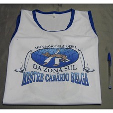 DUAS CAMISETAS REGATAS IGUAIS (TAM GG E G), EM MALHA BRANCA, COM DETALHE AZUL NAS CAVAS E NA GOLA. NA FRENTE, A INSCRIÇÃO 'ASSOCIAÇÃO DE CAPOEIRA DA ZONA ZUL / MESTRE CANÁRIO BELGA' E DESENHO DE DOIS HOMENS JOGANDO CAPOEIRA. ATRÁS, MESMA ESTAMPA E 'CAPOEIRA É CULTURA / CAPOEIRA SHOW IN BRAZIL...'.