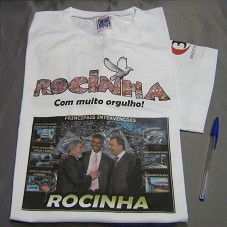 CAMISETA (TAM GG) EM MALHA BRANCA, DE MANGA CURTA. NA FRENTE, FOTOGRAFIA MOSTRANDO O PRESIDENTE LULA JUNTO AO GOVERNADOR SERGIO CABRAL E AO LÍDER DA COMUNIDADE DA ROCINHA, WILLIAM DE OLIVEIRA, TENDO AO FUNDO, FOTOGRAFIAS DAS INTERVENÇÕES FEITAS NA COMUNIDADE. POSSUI A INSCRIÇÃO 'ROCINHA COM MUITO ORGULHO'. NAS MANGAS, '3MS / SERVIÇOS DIGITAIS PERSONALIZADOS'.