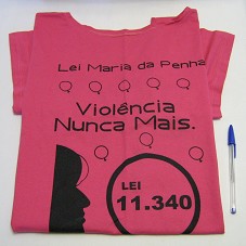 CAMISETA DE CORTE FEMININO, NA COR ROSA. NA FRENTE, ESTAMPA EM PRETO, COM DESENHO DO PERFIL DE UMA MULHER, E A INSCRIÇÃO 'LEI MARIA DA PENHA / VIOLÊNCIA NUNCA MAIS / LEI 11.340'. ATRÁS, 'LIGUE 180 / CENTRAL DE ATENDIMENTO A MULHER / ENVIDA RIO / ...'.