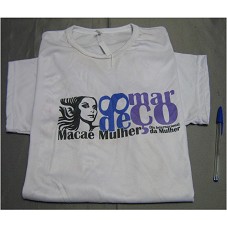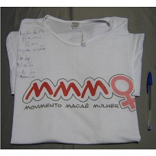 CAMISETA (TAM M), EM MALHA BRANCA, DE MANGA CURTA. NA FRENTE, ESTAMPA EM VERMELHO E CINZA, A INSCRIÇÃO 'MMM / MOVIMENTO MACAÉ MULHER', E MANUSCRITO 'LULA MACAÉ EM SUAS MÃOS / VOTE NÃO / MARLI DA AROEIRA'.