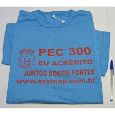 CAMISETA (TAM G) EM MALHA AZUL, DE MANGA CURTA. NA FRENTE, ESTAMPA EM VERMELHO, 'PEC 300 EU ACREDITO / JUNTOS SOMOS FORTES / WWW. ASSINAP. COM.BR'. ATRÁS, 'EU FUI À BRASÍLIA'.