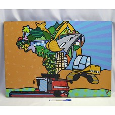 QUADRO (50X70 CM) SEM MOLDURA, COM PINTURA SOBRE TELA, EM TONS COLORIDOS. RETRATA O MAPA DO BRASIL, COM UMA COLHEITADEIRA NO EXTREMO SUL, E UM TRATOR-ESCAVADEIRA AO LADO. NO MAPA, DESENHOS DE VEGETAÇÕES, CASAS, EDIFÍCIOS E RODOVIAS. POSSUI FUNDO EM TONS MARROM E AZUL. NA PARTE POSTERIOR DO QUADRO, CARIMBO DA 'ASSOCIAÇÃO CULTURAL PINTURA SOLIDÁRIA' E 'CASE FIAT GROUP / MULTIAÇÃO - PROGRAMA DE AÇÕES DE SUSTENTABILIDADE'