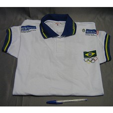 CAMISA GOLA PÓLO (TAM GG), DE MANGA CURTA, COM GOLA AZUL. NA FRENTE, LOGOMARCA DO GOVERNO DO RIO DE JANEIRO E ESTAMPA COM DESENHO DA BANDEIRA BRASILEIRA E DOS ANÉIS OLÍMPICOS. ATRÁS, 'BRASIL / JUDÔ'.