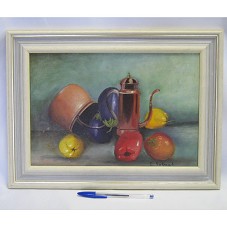 QUADRO (32X43 CM) COM MOLDURA EM MADEIRA CLARA, E DETALHE EM DOURADO. EMOLDURA PINTURA SOBRE TELA RETRATANDO UMA NATUREZA MORTA, COM FRUTAS E LEGUMES ENTRE UM BULE E UMA JARRA DE COBRE. NO CANTO INFERIOR DIREITO, ASSINATURA DO ARTISTA 'C. SOBRAL'.