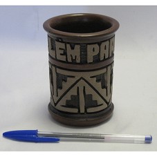 JARRO (10X8X8 CM) DE FORMATO CILÍNDRICO, CONFECCIONADO EM ARGILA. POSSUI DESENHOS ESTILO MARAJOARA E A INSCRIÇÃO 'BELÉM PARÁ'.