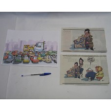 CONJUNTO DE TRÊS CHARGES. A PRIMEIRA, EM PAPEL SULFITE (TAM A4), COLORIDA, MOSTRANDO UM CINEMA DRIVE-IN, PASSANDO, NA TELA, O FILME 'LULA O FILHO DO BRASIL', TENDO NO ESTACIONAMENTO DIVERSOS CARROS, E O PRESIDENTE LULA ASSISTINDO O FILME DO AVIÃO PRESIDENCIAL. A SEGUNDA (16X24 CM), RECORTE DE JORNAL, MOSTRA O PRESIDENTE DA FRANÇA, NICOLAS SARKOZY, MOSTRANDO A PARTE INTERNA DO SEU SOBRETUDO, ONDE HÁ MINIATURAS DE AVIÕES CAÇAS, COM SUA ESPOSA, CARLA BRUNI, AO LADO, E O CASAL PRESIDENCIAL BRASILEIRO OBSERVANDO, COM O PRESIDENTE LULA FALANDO 'GALEGA, ESSE SIM ENTENDE DE AVIÃO'. A TERCEIRA (15X24 CM), MOSTRA APENAS O PRESIDENTE FRANCÊS, EM MESMA POSIÇÃO. TODAS ASSINADAS PELO ARTISTA 'PAIXÃO'.