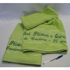 DUAS TOALHAS DE BANHO IGUAIS (70X140 CM), NA COR VERDE, COM FAIXA PARA BORDADO, ONDE HÁ A INSCRIÇÃO 'SIND. PLÁSTICOS E QUÍMICOS DE CRICIÚMA - 25 ANOS'.