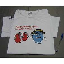 CAMISETA (TAM GG) EM MALHA BRANCA, DE MANGA CURTA. NA FRENTE, ESTAMPA COM DESENHO ESTILIZADO DE UM PAR DE RINS OLHANDO ASSUSTADOS PARA O 'DIABETES', E A INSCRIÇÃO 'PROTEJA SEUS RINS / CONTROLE O DIABETES'. NA PARTE INFERIOR, PRÓXIMA À BARRA DA CAMISETA, 'PRÓ-RENAL / BRASIL' E 'DIA MUNDIAL DO RIM / 11 DE MARÇO 2010'.