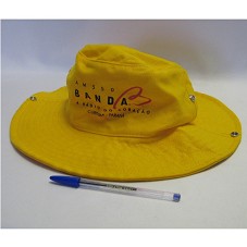 CHAPÉU, TIPO AUSTRALIANO, EM TECIDO NA COR AMARELA. NA FRENTE, A INSCRIÇÃO 'AM 550 / BANDA B / A RÁDIO DO CORAÇÃO / CURITIBA - PARANÁ'. ATRÁS, 'OI, OI GENTE QUERIDA'.