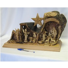 ESCULTURA (24,5X43X18 CM) CONFECCIONADA EM MADEIRA CLARA, REPRESENTANDO O CENÁRIO DE UM PRESÉPIO. USA DE UM TRONCO DE ÁRVORE PARA MONTAGEM DO CENÁRIO, ONDE SÃO MOSTRADAS TRÊS CENAS. NA PRIMEIRA, UM HOMEM COM OS BRAÇOS ABERTOS; NA SEGUNDA, A VIRGEM MARIA RECEBENDO A VISITA DO ANJO; NA TERCEIRA, O NASCIMENTO DO MENINO JESUS. FIXADA EM BASE DE MADEIRA (3X46,5X22,5 CM), ONDE NO FUNDO HÁ CARIMBO COM A INSCRIÇÃO 'ZACHARIA BROS. / BETHLEHEM'. ACOMPANHA CARTÃO COM NOME DO AGENTE. ACONDICIONADA EM ESTOJO (27X53X32,5 CM) FORRADO DE VELUDO VERDE, COM BRASÃO DO GOVERNO NA TAMPA.