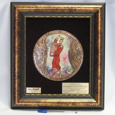 QUADRO (40,5X30,5 CM) COM MOLDURA EM MADEIRA PINTADA EM TOM ACOBREADO. POSSUI FUNDO EM VELUDO VINHO. FIXADA, NO CENTRO, PLACA CIRCULAR (19 CM), EM COBRE, COM GRAVURA PINTADA SOBRE FUNDO BRANCO, RETRATANDO O REI DAVI. AO REDOR, OUTRAS GRAVURAS NA PLACA E NOME DA PEÇA E DO ARTISTA. PLACA POSSUI CAMADA TRANSPARENTE DE RESINA. NA PARTE INFERIOR DO QUADRO, DUAS PLACAS METÁLICAS. NA PRIMEIRA, A INSCRIÇÃO 'MARC CHAGALL / ADAGP. PARIS 1993 ; 1766/2450'. NA SEGUNDA, 'PRESENTED TO THE PRESIDENT OF BRAZIL / HIS EXCELLENCY LUIZ INÁCIO LULA DA SILVA / A COURAGEOUS LEADER OF HIS PEOPLE / WITH BEST WISHES / REUVEN (RUBY) RIVLIN - SPEAKER OF THE KNESSET / JERUSALEM / MARCH 2010 - ADAR 5770'.