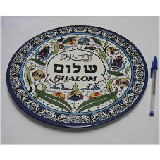 PRATO DECORATIVO (27 CM) CONFECCIONADO EM CERÂMICA, NA COR BEGE. POSSUI BORDA PINTADA EM TONS DE AZUL; E CENTRO DO PEÇA COLORIDO, COM MOTIVOS FLORAIS. NO CENTRO, A INSCRIÇÃO 'SHALOM' E OUTRAS EM ÁRABE. NA PARTE POSTERIOR, CARTÃO DE VISITA DO AGENTE.