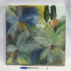 QUADRO (32X32 CM) SEM MOLDURA, COM PINTURA SOBRE TELA, EM TONS DE VERDE, AZUL E AMARELO, RETRATANDO, EM PRIMEIRO PLANO, A FOLHAGEM DE PALMEIRAS. NA PARTE POSTERIOR, NOME DO ARTISTA.