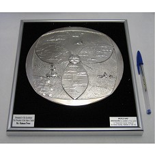 QUADRO (27X24 CM) COM MOLDURA EM ALUMÍNIO E FUNDO EM VELUDO PRETO. FIXADA, NO CENTRO, PLACA CIRCULAR (19,5 CM) EM METAL PRATEADO, COM DESENHO DE UMA FLOR DE TRÊS PÉTALAS, TENDO AO CENTRO, A CIDADE DE JERUSALÉM. EM CADA PÉTALA, EUROPA, ÁSIA E ÁFRICA. AO REDOR, OS OCEANOS, E REPRESENTAÇÃO DA AMÉRICA NO CANTO INFERIOR ESQUERDO. NA PARTE INFERIOR DO QUADRO DUAS PLACAS MÉTALICAS CONTENDO A INSCRIÇÃO 'PRESENTED BY HIS EXCELLENCY THE PRESIDENT OF THE STATE OF ISRAEL / MR. SHIMON PERES' E 'WORLD MAP / JERUSALEM IN CENTER OF THE WORLD IN ITINERARIUM SACRAE SCRIPTURA / BY HEINRICH BUENTIG. PUBLISHED IN 1585 A.D.'. ACONDICIONADO EM CAIXA DE PAPELÃO.