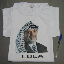 CAMISETA (TAM XL) EM MALHA BRANCA, DE MANGA CURTA. NA FRENTE, ESTAMPA COM FOTOMONTAGEM DO PRESIDENTE LULA USANDO UMA ESPÉCIE DE TURBANTE BRANCO COM DETALHES PRETOS NA CABEÇA. ABAIXO, A INSCRIÇÃO 'LULA'.