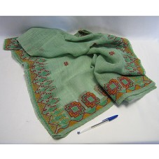 TOALHA DE MESA (136X66 CM) EM TECIDO VERDE, TIPO GAZE. POSSUI BORDADO DE MOTIVOS FLORAIS E GEOMÉTRICOS EM TODA BORDA, NAS CORES VERDE, VINHO E AMARELO.