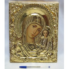 QUADRO (30X24,5 CM) PINTURA RETRATANDO O ROSTO DE NOSSA SENHORA AO LADO DO MENINO JESUS. EMOLDURANDO A PINTURA, PLACA EM METAL DOURADO, ESCULTURA BIDIMENSIONAL, FORMANDO O MANTO E A COROA DA VIRGEM MARIA, A TÚNICA DO MENINO JESUS E A PRÓPRIA MOLDURA DO QUADRO, COM MOTIVOS FLORAIS. POSSUI FUNDO EM MADEIRA REVESTIDA DE VELUDO AZUL MARINHO. ACONDICIONADO EM CAIXA FORRADA NAPA VINHO.