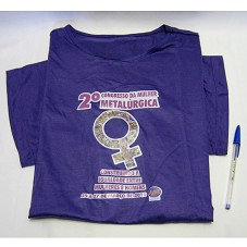 CAMISETA (TAM G) EM MALHA DE COR ROXA, DE MANGA CURTA. NA FRENTE, ESTAMPA CONTENDO A INSCRIÇÃO '2º CONGRESSO DA MULHER METALÚRGICA / CONSTRUINDO A IGUALDADE ENTRE MULHERES E HOMENS / 25 A 27 DE MARÇO DE 2010', E LOGOMARCA DO 'SINDICATO DOS METALÚRGICOS DO ABC'.