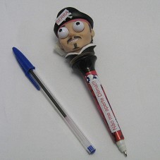 CANETA ESFEROGRÁFICA (17 CM). POSSUI CORPO EM PLÁSTICO DE COR VERMELHO, COM DESENHOS DE ESTRELAS, EM VERMELHO, ROSA E PRETO, E DE PAR DE OLHOS SOBRESSASTADOS. NA PARTE SUPERIOR, EM BORRACHA, A CABEÇA DE UM PIRATA, QUE AO SER APERTADA, OS OLHOS SE SALTAM. NO CHAPÉU DO PIRATA, PAPEL COLADO CONTENDO A INSCRIÇÃO 'SERRA'; NO CORPO, 'NÃO ME APERTE DILMA'.