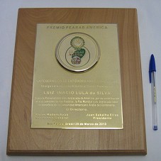 PRÊMIO FEARAB AMÉRICA. PLACA (21X16 CM) EM METAL DOURADO FOSQUEADO, COM BORDAS E LETRAS POLIDAS. AO CENTRO SUPERIOR, MEDALHA (85 MM) EM MESMO MATERIAL, CONTENDO LOGOMARCA DA INSTITUIÇÃO. NA PLACA, A INSCRIÇÃO 'PREMIO FEARAB AMERICA / LA FEDERACIÓN DE ENTIDADES AMERICANO ÁRABE OTORGA ESTE RECONOCIMIENTO AL SEÑOR PRESIDENTE LUIZ INACIO LULA DA SILVA / COMO LA PERSONALIDAD MÁS DESTACADA DE AMÉRICA, POR SU CONTRIBUICIÓN AL ACERCAMIENTO DE LOS PUEBLOS, LA PAZ MUNDIAL Y SU DESTACADA LABOR EN BENEFICIO DE LA COMUNIDAD AMERICANCO ÁRABE DEL CONTINENTE. EL DIRECTORIO. KARIM MADAIN AYUB / SECRETARIO GENERAL / JUAN SAKALHA ELÍAS / PRESIDENTE / SAO PAULO, BRAZIL 25 DE MARZO DE 2010'. FIXADA EM BASE DE MADEIRA CLARA (29,5X324X2 CM). ACONDICIONADA EM ESTOJO FORRADO DE LYCRA AZUL MARINHO.