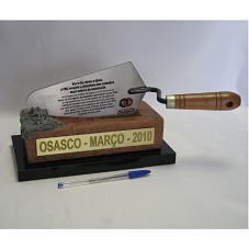 PLACA (9,5X20,5 CM), EM METAL PRATEADO, RECORTADA E COLADA SOBRE UMA PÁ DE PEDREIRO, CONTENDO A INSCRIÇÃO 'DIA A DIA, TIJOLO A TIJOLO, O PAC RESGATA A CIDADANIA DAS CAMADAS MAIS POBRES DA POPULAÇÃO / HOMENAGEM DO PREFEITO DE OSASCO EMÍDIO DE SOUZA AO EXMO. SR. PRESIDENTE DA REPÚBLICA LUIZ INÁCIO LULA DA SILVA, EM AGRADECIMENTO AOS INVESTIMENTOS EM INFRAESTRUTURA, HABITAÇÃO E SANEAMENTO REALIZADOS EM NOSSO MUNICÍPIO, POR MEIO DO PROGRAMA DE ACELERAÇÃO DO CRESCIMENTO (PAC), ....'. A PÁ DO PEDREIRO ESTÁ FIXADA EM TIJOLO MACIÇO (5,5X22,5X10,5 CM), TENDO NA LATERAL ESQUERDA, UM POUCO DE ARGAMASSA, E, NA FRENTE, PLACA METÁLICA COM A GRAVAÇÃO 'OSASCO - MARÇO - 2010'. FIXADO EM BASE DE ACRÍLICO PRETA (2X26X14 CM).