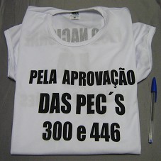 DUAS CAMISETAS IGUAIS (TAM M) EM MALHA BRANCA, DE MANGA CURTA. NA FRENTE, ESTAMPA EM PRETO, 'PELA APROVAÇÃO DAS PEC'S 300 E 446'. ATRÁS, 'PISO NACIONAL JÁ / APOIO: GERALDO SIMÕES'.
