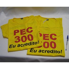 DUAS CAMISETAS IGUAIS (TAM G) EM MALHA AMARELA, UMA DE MANGA CURTA, A OUTRA REGATA. NA FRENTE, ESTAMPA EM PRETO E VERMELHO, 'PEC 300 EU ACREDITO'. ATRÁS, 'APPM / SINDPOC / BAHIA / PELA APROVAÇÃO DO PISO NACIONAL JÁ'.