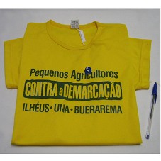 DUAS CAMISETAS IGUAIS (TAM M E G) EM MALHA AMARELA, DE MANGA CURTA. NA FRENTE, ESTAMPA EM VERDE, CONTENDO A INSCRIÇÃO 'PEQUENOS AGRICULTORES / CONTRA A DEMARCAÇÃO / ILHÉUS - UNA - BUERAREMA'. EM UMA DELAS, BROCHE EM PLÁSTICO, NA COR AZUL, COM A INSCRIÇÃO 'PR / BRASIL' E MAPA DO BRASIL. CAMISETAS ESTÃO UM POUCO SUJAS E COM ASPECTO DE USADAS.