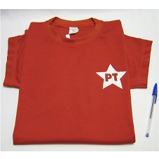 CAMISETA (TAM G) EM MALHA VERMELHA, DE MANGA CURTA. NA FRENTE, EM BRANCO, ESTAMPA COM DESENHO DE UMA ESTRELA E A INSCRIÇÃO 'PT'. ATRÁS, 'PT É POVO / MASCOTE BAHIA'. CAMISETA COM ASPECTO DE USADA