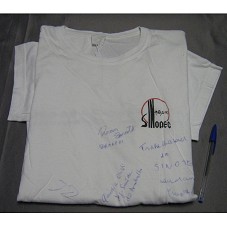 CAMISETA EM MALHA BRANCA, DE MANGA CURTA. NA FRENTE, LOGOMARCA DA 'SINOPEC'. ATRÁS, 'SINOPEC INTERNATIONAL PETROLEUM SERVICE DO BRASIL LTDA'. POSSUI VÁRIAS INSCRIÇÕES EM CANETA ESFEROGRÁFICA E DEDICATÓRIA 'TRABALHADORES DA SINOPEC SAUDAM O PRESIDENTE LULA'. CAMISETA COM ASPECTO DE USADA.