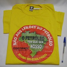 CAMISETA (TAM M) EM MALHA AMARELA, DE MANGA CURTA. NA FRENTE, ESTAMPA COM UM CÍRCULO VERMELHO, CONTENDO O MAPA DO BRASIL, E A INSCRIÇÃO 'NÃO AOS LEILÕES DO PETRÓLEO / PETROBRÁS 100% ESTATAL E PÚBLICA / O PETRÓLEO TEM QUE SER NOSSO / COOTRASF'. ATRÁS, 'O PETRÓLEO TEM QUE SER NOSSO / PETROBRÁS 100% ESTATAL E PÚBLICA / COOTRASF'.