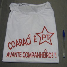 CAMISETA REGATA EM MALHA BRANCA. NA FRENTE, EM VERMELHO, ESTAMPA COM DESENHO DE UMA ESTRELA E A INSCRIÇÃO 'COARACI É PT / AVANTE COMPANHEIROS'.