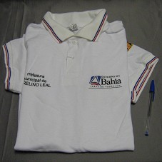 CAMISA GOLA PÓLO (TAM M), NA COR BRANCA, DE MANGA CURTA. NA FRENTE, A INSCRIÇÃO 'PREFEITURA MUNICIPAL DE AURELINO LEAL' E LOGOMARCA DO 'GOVERNO DA BAHIA'. NAS MANGAS, LOGOMARCA DO GOVERNO FEDERAL E 'SAÚDE DA FAMÍLIA DE TODOS NÓS'.