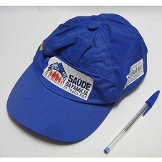 BONÉ EM TECIDO AZUL. NA FRENTE, A INSCRIÇÃO 'SAÚDE DA FAMÍLIA DE TODOS NÓS', E LOGOMARCA. NAS LATERAIS, LOGOMARCAS DO 'GOVERNO DA BAHIA' E DO GOVERNO FEDERAL. ATRÁS 'IBICARAÍ-BA'.